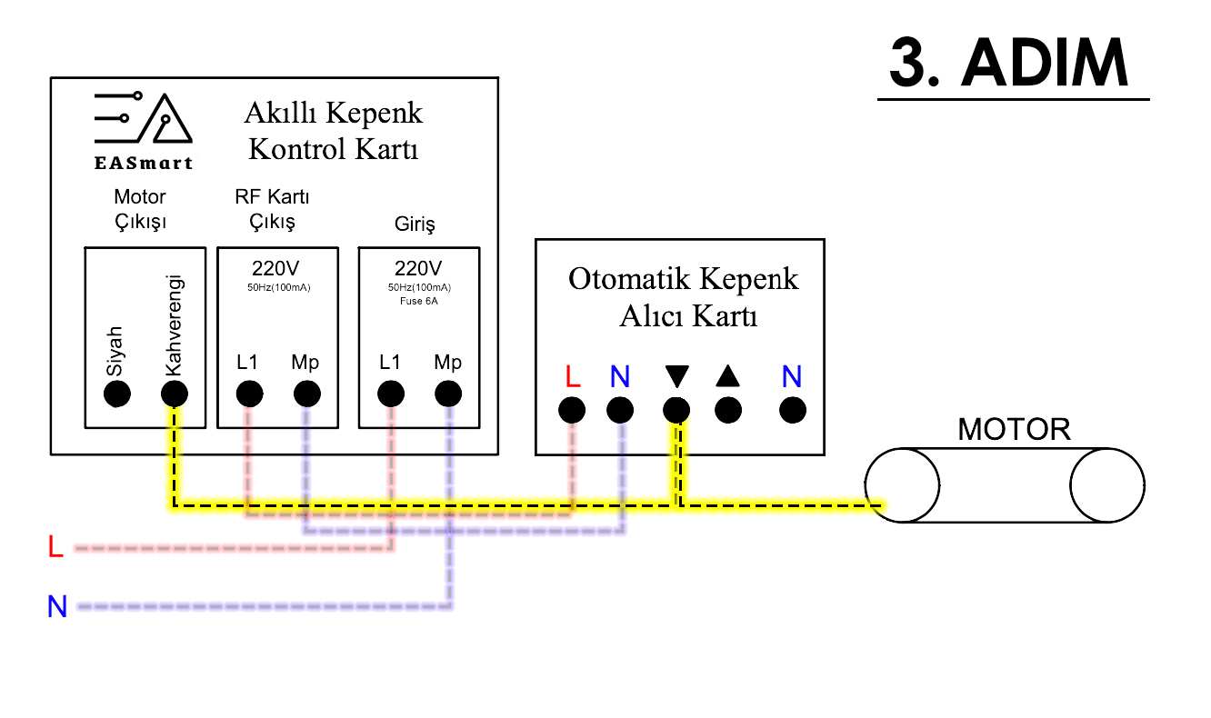 1. Adımda ilk olarak Otomatik Kepenk Alıcı Kartı (Kumanda Alıcı Kartı)’ndaki tüm kabloları söküyoruz. Ardından L ve N bağlantılarını EASmart üzerindeki Giriş yazan L1 ve Mp klemenslerine bağlıyoruz. Bu sayede EASmart Akıllı Kepenk Kontrol Kartımıza güç girişini bağlamış olduk.2. Adımda Kumanda Alıcı Kartına güç girişini EASmart Akıllı Kepenk Kontrol Kartı üzerinden yapacağız. EASmart üzerindeki RF Kartı Çıkış yazan L1 ve Mp klemenslerinden; Kumanda Kartının L ve N klemenslerini kablo ile bağlayıp, Kumanda Alıcı Kartının güç girişini yapıyoruz.3. Adımda EASmart Akıllı Kepenk Kontrol Kartımızın Kumanda Alıcı Kartı ile beraber çalışabilmesi için Motorun Kahverengi kablosunu hem EASmart üzerindeki Kahverengi klemense hem de Kumanda Alıcı Kartının Aşağı Ok gösteren klemensine bağlıyoruz.4. Adımda bir önceki adıma benzer durumu Siyah kablo için yapıyoruz. Motorun Siyah kablosunu hem EASmart üzerindeki Siyah klemense hem de Kumanda Kartının Yukarı Ok gösteren klemensine bağlıyoruz.5. Adımda da son olarak Motorun Nötr (Mavi) kablosunu Kumanda Kartının N klemensine bağlıyoruz.